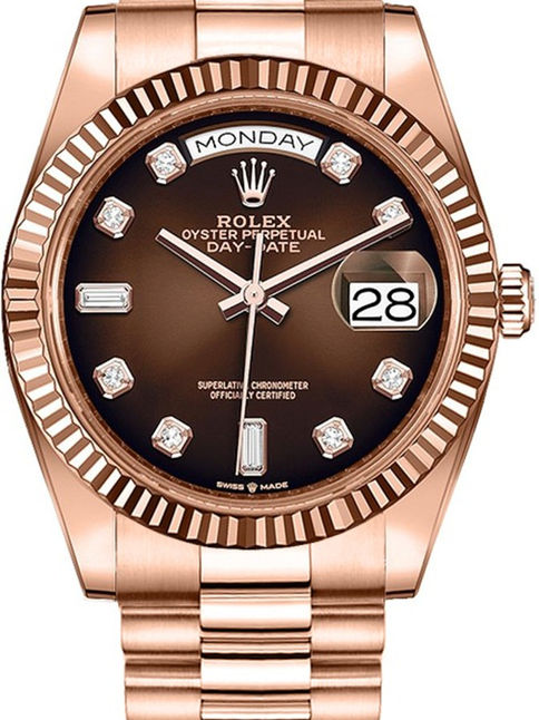 Rolex Perpetual Day-Date 36 Watch of 18k Everose Gold. Brown ombré dial set with diamonds. The 18k Everose Gold fluted bezel. The 18k Everose Gold President bracelet, 128235-0037. Rolex Perpetual Day-Date 36 Watch of 18k Everose Gold. Brown ombré dial set with diamonds. Hour markers are Diamonds in 18 ct gold settings and baguette-cut diamonds at 6 and 9 o'clock. Screw-down solid crown with twin lock double waterproofness system. Scratch-resistant sapphire crystal with cyclops lens over the date. The watch has central hour, minute, and second hands. Instantaneous day and date in apertures, unrestricted rapid setting. Stop-seconds for precise time setting. The 18k Everose Gold fluted bezel. The Watch comes with Mechanical Self-winding Movement & 3255 Caliber w/ 31 jewels & 70 hours power reserve. The 18k Everose Gold President with concealed folding Crownclasp. The Watch is with a Rolex Watch box, Rolex Warranty Card. Covered with Rolex Warranty.